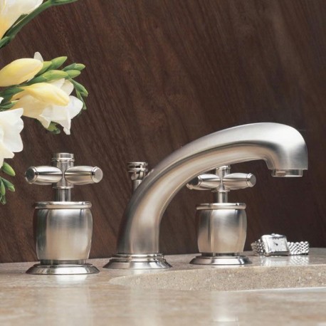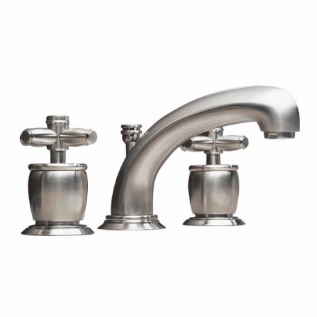 From the Michael Berman American Moderne CollectionCross handlesFixed spout3 x 1 3/8" hole cutouts1/4-turn ceramic disc valvesPop-up drain, 1 1/4" pipeCenter-to-center: 8" to 12" recommended1/2" NPT connectionsLow flow 1.5 GPM aerator availableFinishes- Polished Chrome, Polished Nickel, Satin Nickel, Tuscan Brass and Inca Brass.