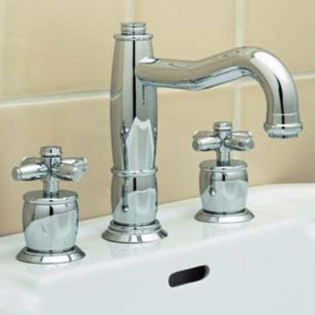 From the Michael Berman American Moderne CollectionCross handlesFixed spout3 x 1 3/8" hole cutouts1/4-turn ceramic disc valvesPop-up drain, 1 1/4" pipeCenter-to-center: 8" to 12" recommended1/2" NPT connectionsLow flow 1.5 GPM aerator availableFinishes- Polished Chrome, Polished Nickel, Satin Nickel, Tuscan Brass and Inca Brass.