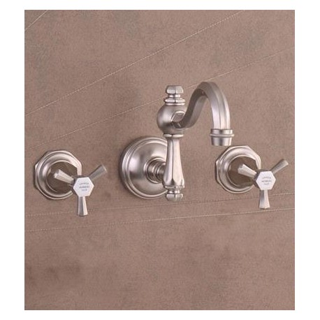 Art Deco style in a sophisticated wall mounted set. Featuring a 6 ¾” swiveling spout and 11 ¾” spread.