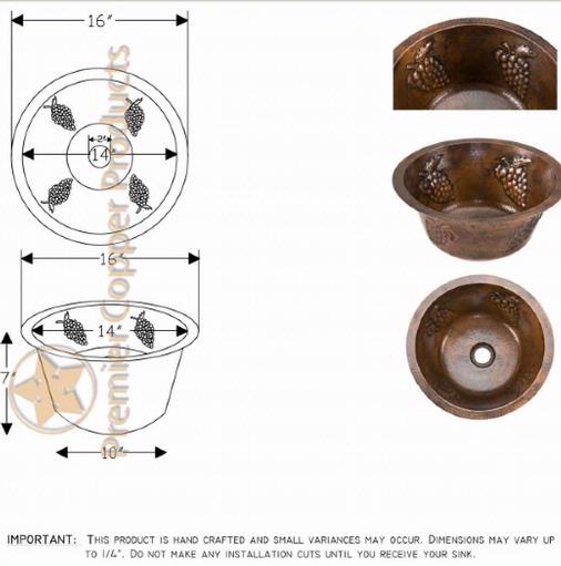 Countertop Depth Minimum: 19" Front to BackInner Dimension 14" x 14" x 7"17 Gauge CopperRoundOil Rubbed Bronze Color2" Drain Size1" Flat RimUndermount or Surface Mount Installation