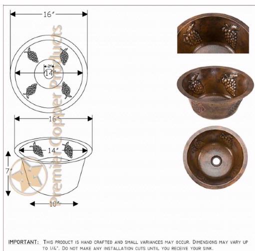 Countertop Depth Minimum: 19" Front to BackInner Dimension 14" x 14" x 7"17 Gauge CopperRoundOil Rubbed Bronze Color3.5" Drain Size1" Flat RimUndermount or Surface Mount Installation