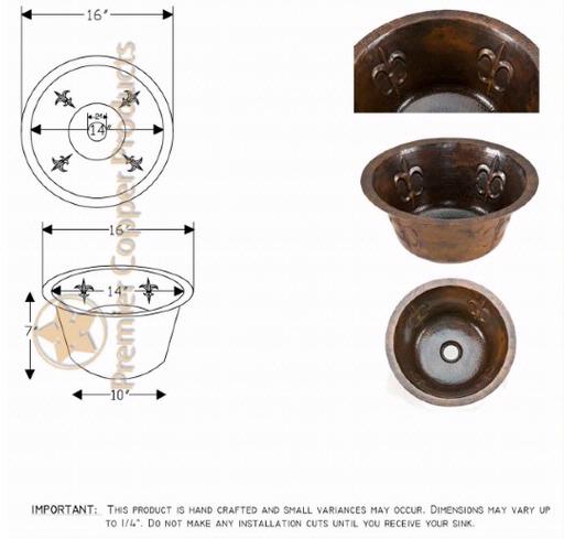 Inner Dimension 14" x 14" x 7"Countertop Depth Minimum: 19" Front to BackRoundOil Rubbed Bronze Color17 Gauge Copper3.5" Drain Size1" Flat RimUnder Counter or Surface-Mount Installation