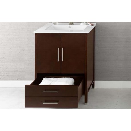 Streamlined design combined with modern flair, the Juno vanity reflects a refined style with a modern flair. Functionality meets classic chic with its soft close frosted glass or solid doors, easy-access full extension drawers and eye-catching dovetail construction. Optional drawer banks allow for additional space to hold everything you need and allow you to expand the Juno into a double sink vanity fit for any size bathroom. With a rich cinnamon and luxuriant dark cherry finishes throughout and optional metal feet, the Juno vanity shows off the expert craftsmanship with innovative design. .