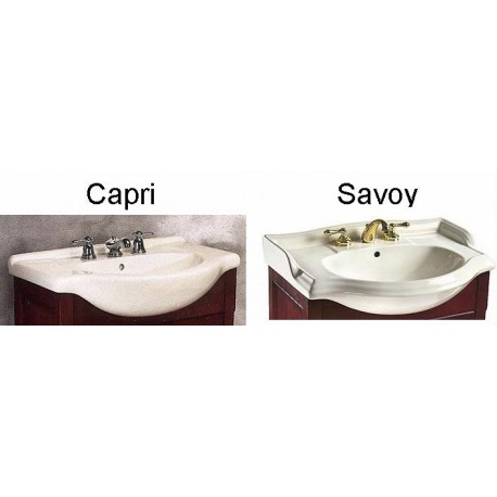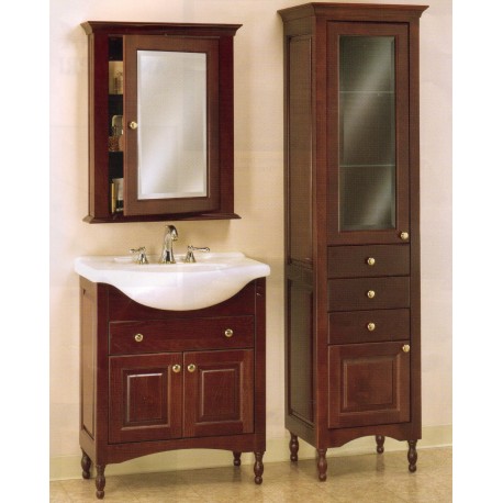 The Windsor Vanity is shown with a Capri Vitreous China top. Complimented with a Curio Cabinet and a 8" deep semi-recessed Medicine Cabinet. This furniture quality collection is available in a dark cherry with brass knobs or in a light cherry finish with Satin Nickel knobs. The Capri top is available in white and biscuit.