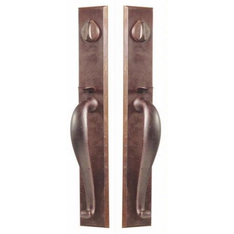 Knobs and lever handles are supported by springs mounted behind the rosettes and sideplates. These springs return the handles back to the "rest" position and prevent lever sag. Latches are heavy duty diecast construction, with strong internal springs, solid brass nose bolts and sintered metal cams. A plastic bushing located in the joint between handle and rosette ensures a friction free wear surface. This prevents metal from bearing on metal and provides smooth long-lasting operation. Handles are positively connected to rosettes with a permanent clip and each has a set screw which, when tightened, eliminates "handle wobble". The threaded tubes inside an Emtek lock are machined brass, not steel. The use of brass ensures good threads and prevents corrosion for easy installation and long life.