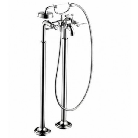 Montreux Freestanding Tub Filler:Lever handlesMounts on floor beside tub1 jet handshower with AIR injection full spray mode90 degree ceramic cartridgeDiverter for 1/2" handshower outlet1/2" male inletSpout reach 9 3/8"50" metal hoseFlow 5.8 GPM @ 44 PSI