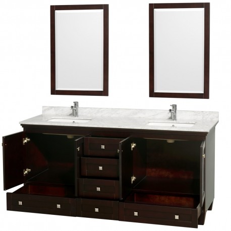 72 inch Double Bathroom Vanity in Espresso, White Carrera Marble Countertop, Undermount Square Sinks, and 24 inch Mirrors