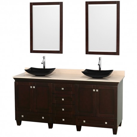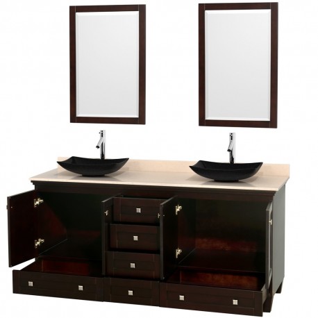 72 inch Double Bathroom Vanity in Espresso, Ivory Marble Countertop, Arista Black Granite Sinks, and 24 inch Mirrors