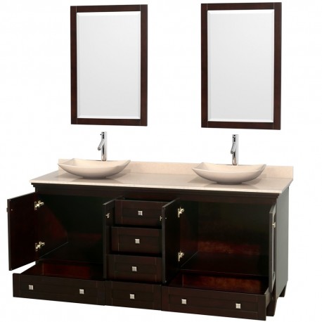 72 inch Double Bathroom Vanity in Espresso, Ivory Marble Countertop, Arista Ivory Marble Sinks, and 24 inch Mirrors