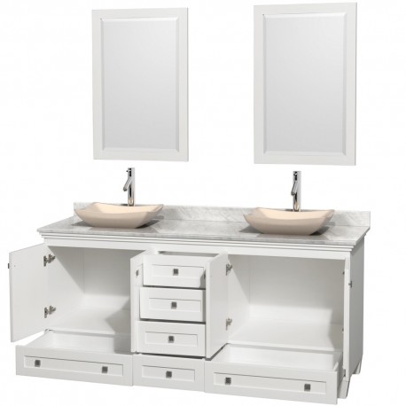 72 inch Double Bathroom Vanity in White, White Carrera Marble Countertop, Avalon Ivory Marble Sinks, and 24 inch Mirrors