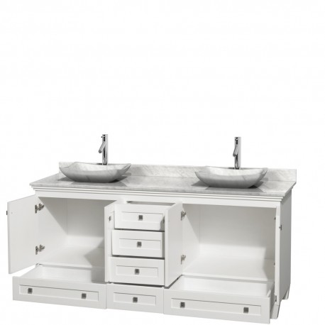 72 inch Double Bathroom Vanity in White, White Carrera Marble Countertop, Avalon White Carrera Marble Sinks, and No Mirrors