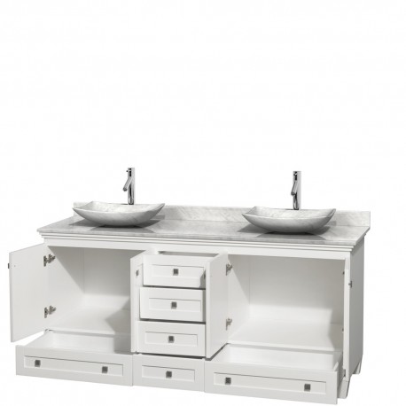 72 inch Double Bathroom Vanity in White, White Carrera Marble Countertop, Arista White Carrera Marble Sinks, and No Mirrors