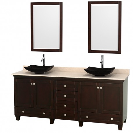 80 inch Double Bathroom Vanity in Espresso, Ivory Marble Countertop, Arista Black Granite Sinks, and 24 inch Mirrors