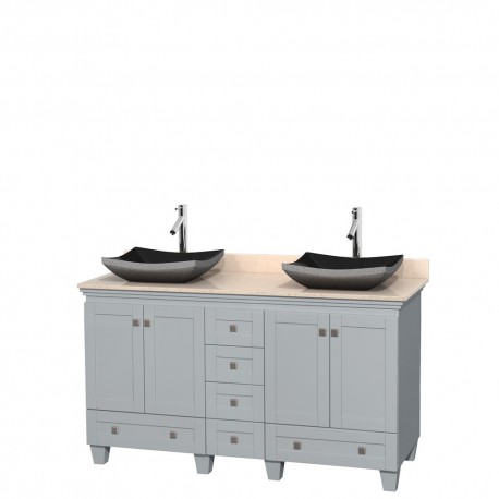 60 inch Double Bathroom Vanity in Oyster Gray, Ivory Marble Countertop, Altair Black Granite Sinks, and No Mirrors