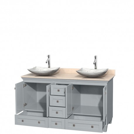 60 inch Double Bathroom Vanity in Oyster Gray, Ivory Marble Countertop, Arista White Carrera Marble Sinks, and No Mirrors