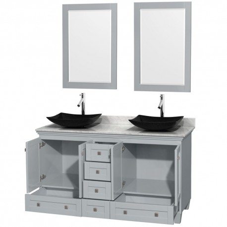 60 inch Double Bathroom Vanity in Oyster Gray, White Carrera Marble Countertop, Arista Black Granite Sinks, and 24 inch Mirrors