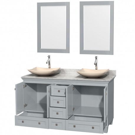 60 inch Double Bathroom Vanity in Oyster Gray, White Carrera Marble Countertop, Arista Ivory Marble Sinks, and 24 inch Mirrors