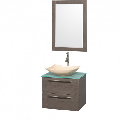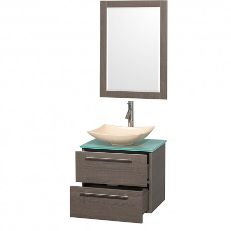24 inch Single Bathroom Vanity in Gray Oak, Green Glass Countertop, Arista Ivory Marble Sink, and 24 inch Mirror
