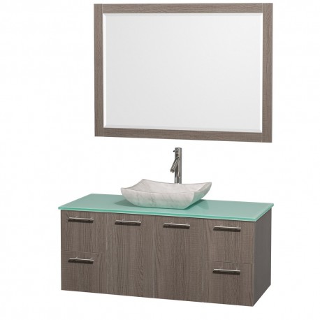 48 inch Single Bathroom Vanity in Gray Oak with Green Glass Top with Carrera Marble Sink, and 46 inch Mirror