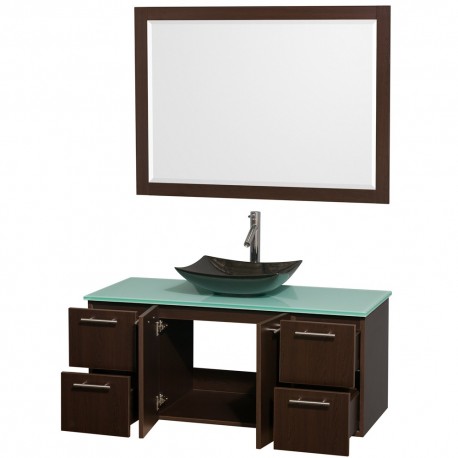 48 inch Single Bathroom Vanity in Espresso, Green Glass Countertop, Arista Black Granite Sink, and 46 inch Mirror