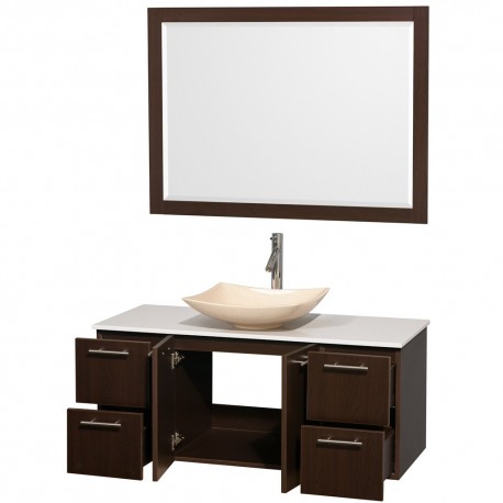 48 inch Single Bathroom Vanity in Espresso, White Man-Made Stone Countertop, Arista Ivory Marble Sink, and 46 inch Mirror