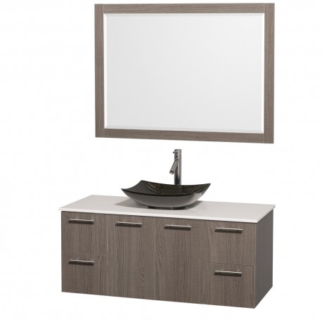 48 inch Single Bathroom Vanity in Gray Oak, White Man-Made Stone Countertop, Arista Black Granite Sink, and 46 inch Mirror