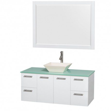 48 inch Single Bathroom Vanity in Glossy White, Green Glass Countertop, Pyra Bone Porcelain Sink, and 46 inch Mirror
