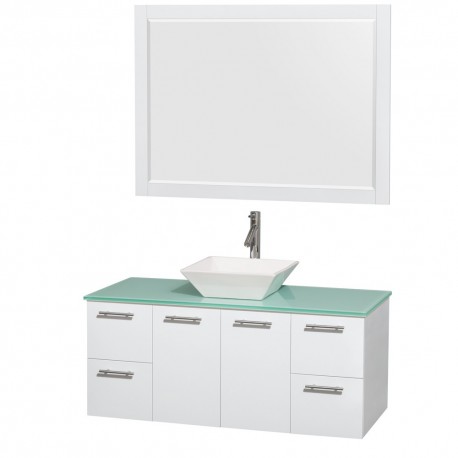 48 inch Single Bathroom Vanity in Glossy White, Green Glass Countertop, Pyra White Sink, and 46 inch Mirror