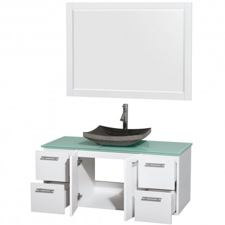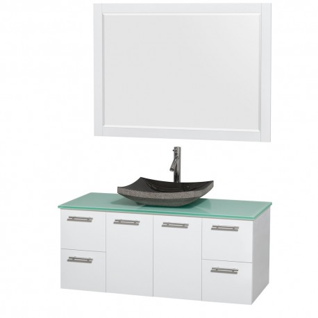 48 inch Single Bathroom Vanity in Glossy White, Green Glass Countertop, Altair Black Granite Sink, and 46 inch Mirror