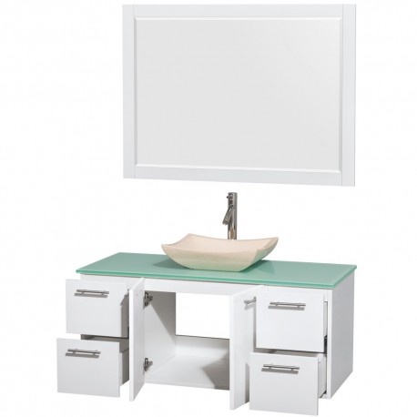 48 inch Single Bathroom Vanity in Glossy White, Green Glass Countertop, Avalon Ivory Marble Sink, and 46 inch Mirror