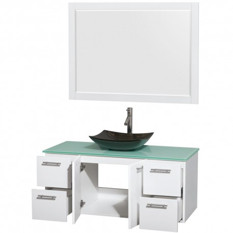 48 inch Single Bathroom Vanity in Glossy White, Green Glass Countertop, Arista Black Granite Sink, and 46 inch Mirror