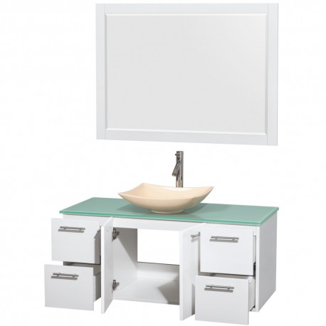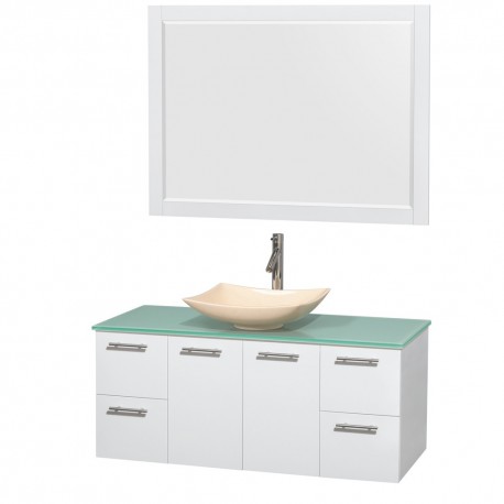 48 inch Single Bathroom Vanity in Glossy White, Green Glass Countertop, Arista Ivory Marble Sink, and 46 inch Mirror