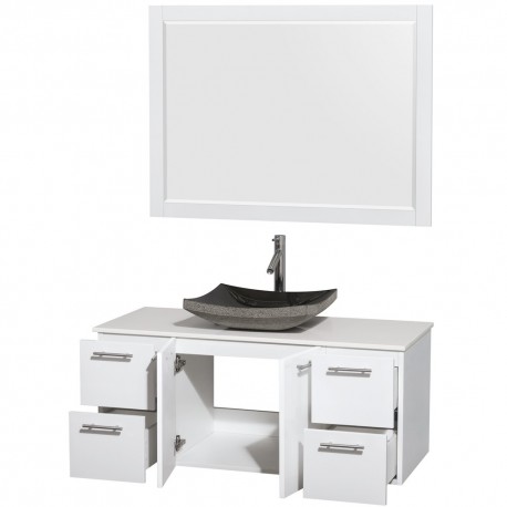 48 inch Single Bathroom Vanity in Glossy White, White Man-Made Stone Countertop, Altair Black Granite Sink, and 46 inch Mirror