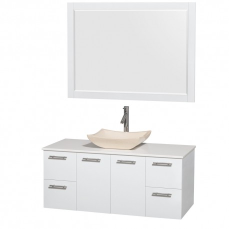 48 inch Single Bathroom Vanity in Glossy White, White Man-Made Stone Countertop, Avalon Ivory Marble Sink, and 46 inch Mirror