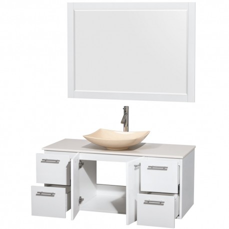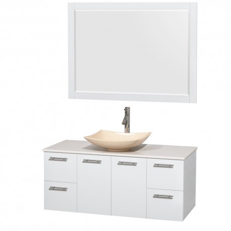 48 inch Single Bathroom Vanity in Glossy White, White Man-Made Stone Countertop, Arista Ivory Marble Sink, and 46 inch Mirror