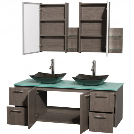 60 inch Double Bathroom Vanity in Gray Oak, Green Glass Countertop, Arista Black Granite Sinks, and Medicine Cabinets
