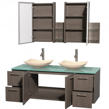 60 inch Double Bathroom Vanity in Gray Oak, Green Glass Countertop, Arista Ivory Marble Sinks, and Medicine Cabinets