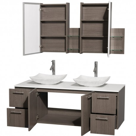 60 inch Double Bathroom Vanity in Gray Oak, White Man-Made Stone Countertop, Arista White Carrera Marble Sinks, and Medicine Cabinets