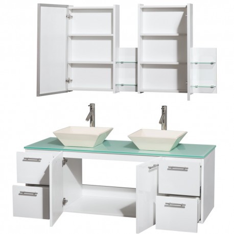 60 inch Double Bathroom Vanity in Glossy White, Green Glass Countertop, Pyra Bone Porcelain Sinks, and Medicine Cabinets