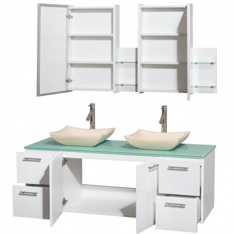60 inch Double Bathroom Vanity in Glossy White, Green Glass Countertop, Avalon Ivory Marble Sinks, and Medicine Cabinets