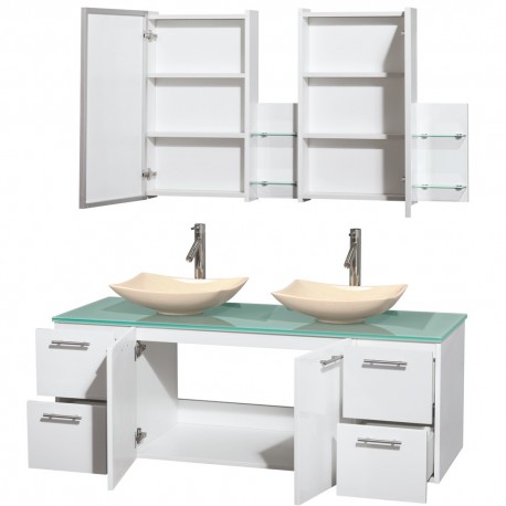 60 inch Double Bathroom Vanity in Glossy White, Green Glass Countertop, Arista Ivory Marble Sinks, and Medicine Cabinets