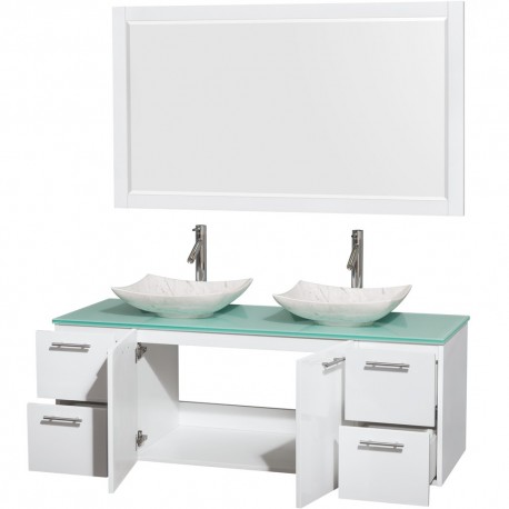 60 inch Double Bathroom Vanity in Glossy White, Green Glass Countertop, Arista White Carrera Marble Sinks, and 58 inch Mirror