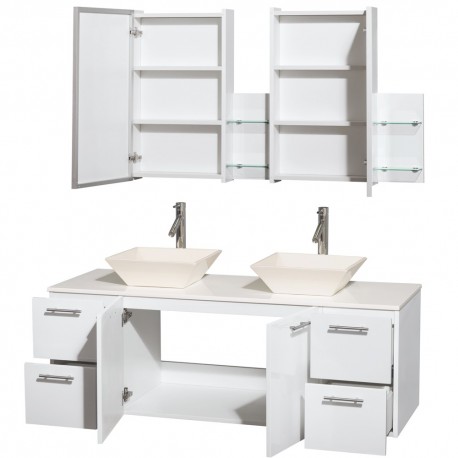 60 inch Double Bathroom Vanity in Glossy White, White Man-Made Stone Countertop, Pyra Bone Porcelain Sinks, and Medicine Cabinets