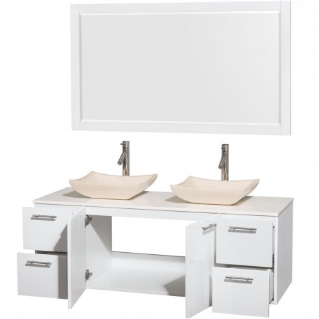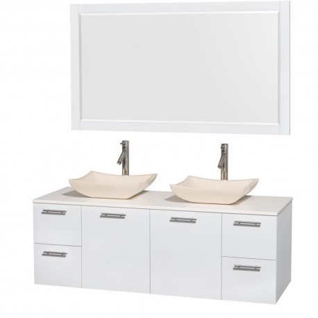 60 inch Double Bathroom Vanity in Glossy White, White Man-Made Stone Countertop, Avalon Ivory Marble Sinks, and 58 inch Mirror