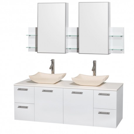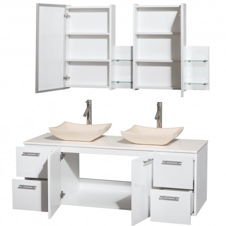 60 inch Double Bathroom Vanity in Glossy White, White Man-Made Stone Countertop, Avalon Ivory Marble Sinks, and Medicine Cabinets