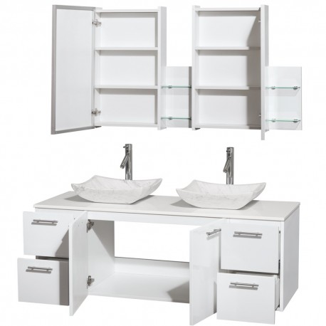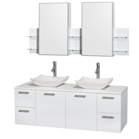 60 inch Double Bathroom Vanity in Glossy White, White Man-Made Stone Countertop, Avalon White Carrera Marble Sinks, and Medicine Cabinets