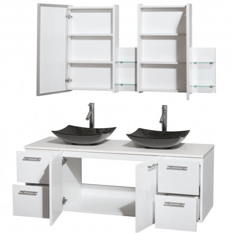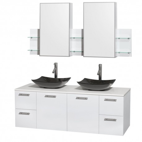 60 inch Double Bathroom Vanity in Glossy White, White Man-Made Stone Countertop, Arista Black Granite Sinks, and Medicine Cabinets