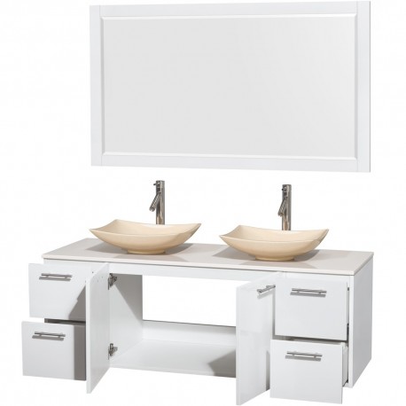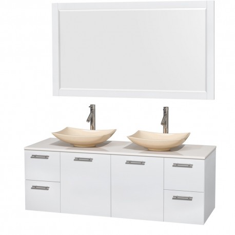 60 inch Double Bathroom Vanity in Glossy White, White Man-Made Stone Countertop, Arista Ivory Marble Sinks, and 58 inch Mirror