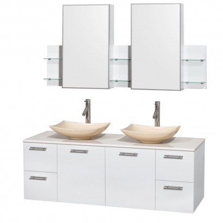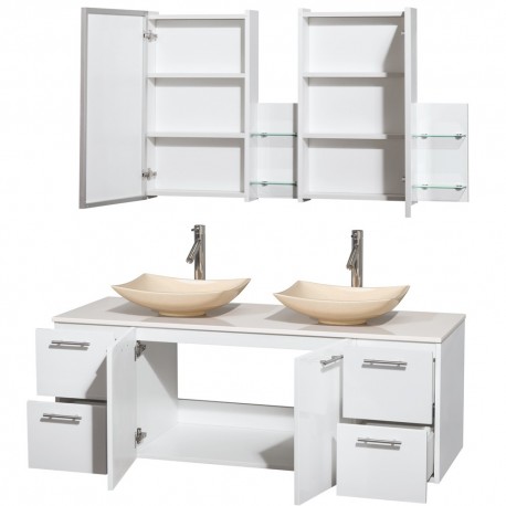 60 inch Double Bathroom Vanity in Glossy White, White Man-Made Stone Countertop, Arista Ivory Marble Sinks, and Medicine Cabinets