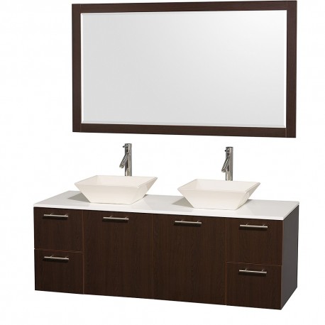 60 inch Double Bathroom Vanity in Espresso with White Man-Made Stone Top with Bone Porcelain Sinks, and 58 inch Mirror